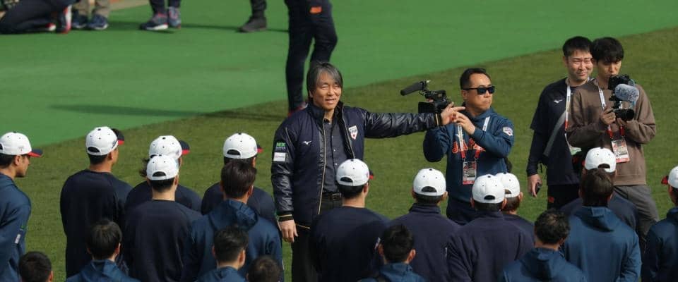黒のシャツ、パンツに侍ジャパンのウインドブレーカーを着込んだ松井氏。「すみません待たせちゃって」と言いながら選手たちの前に立つと、身ぶり手ぶりをまじえながら笑顔で言葉を伝えた。約2分間のミーティング。終了後には大きな拍手もわき起こった。