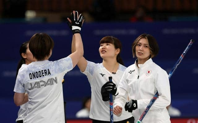 スイスに勝利し、抱き合う吉村紗也香(右)ら日本の選手たち=ロイター