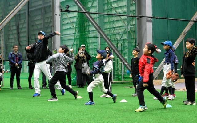 プロ野球・北海道日本ハムファイターズの2軍本拠地・鎌ケ谷スタジアム(千葉県鎌ケ谷市)の屋内練習場で14日、千葉西部朝日会主催の「朝日こども野球教室」があった。