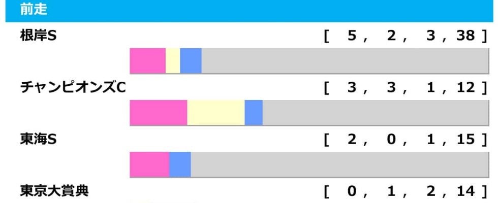 根岸S【5.2.3.38】 チャンピオンズC【3.3.1.12】 東海S【2.0.1.15】 東京大賞典【0.1.2.14】 JBCスプリント【0.1.0.3】 川崎記念【0.1.0.11】 プロキオンS【0.1.0.2】 チャレンジC【0.1.0.0】 武蔵野S【0.0.1.2】 兵庫ゴールドT【0.0.1.1】 名古屋大賞典【0.0.1.0】