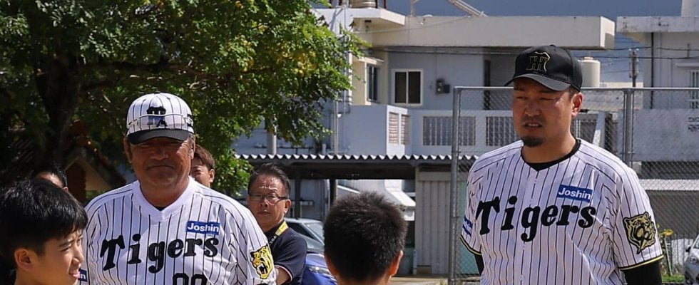 阪神秋山拓巳ベースボールアンバサダー(BA、34)と球団OB会委員の亀山努氏(56)が16日、沖縄・宜野座村とうるま市の…