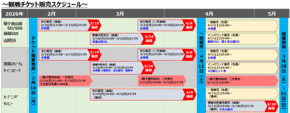 先着での販売となる一般販売は4月11日(土)10時からスタート。同タイミングで海外へのチケット販売も開始し、藤岡SSS観戦券および鞍ケ池公園SD観戦券と豊田スタジアムサービスパーク入場券(4日間セット)が用意される。