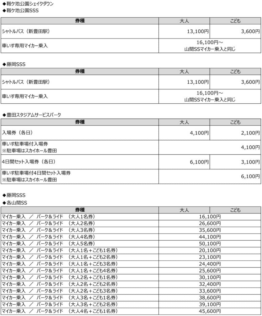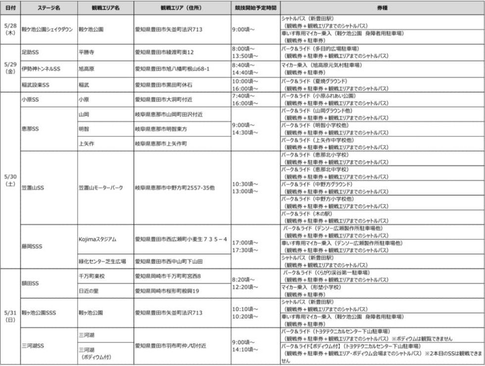 先行販売となっているのは5月28日(木)に行われる鞍ケ池公園シェイクダウン、5月31日(日)の鞍ケ池公園SSS、5月30日(土)の藤岡SSS、その他の山間SS、そして豊田スタジアムサービスパーク入場券が2月16日(月)から3月15日(日)23時59分まで先行販売され、3月19日(木)に抽選結果発表となる。