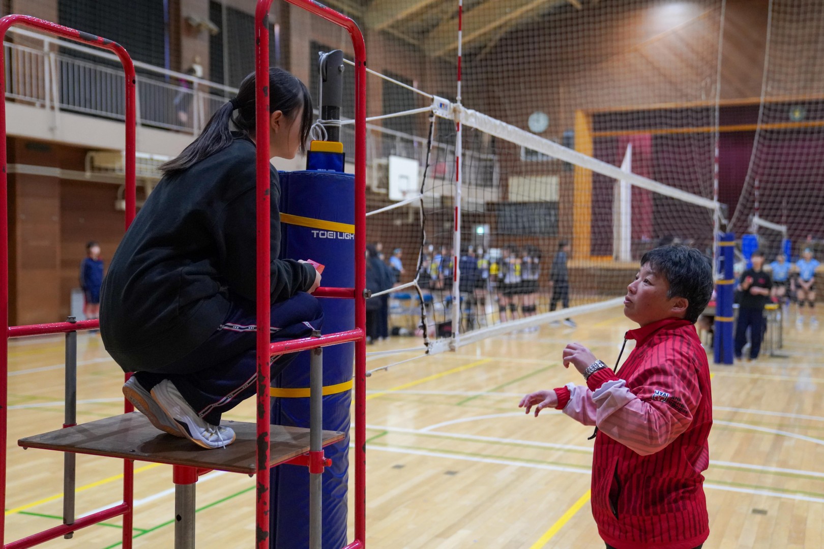 ファーストレフェリーは試合の統括責任者として試合全般の判定を行い、ホイッスルやハンドシグナルを用いて試合を進行する。一方のセカンドレフェリーは、ファーストレフェリーと対面する位置でファーストレフェリーを補佐し、タッチネットの判定やスコアラーと連携してタイムアウト、選手交代をコントロールする。試合中、「今のはこうした方がいいね」「今のジャッジはよかったよ」と中体連の審判員からアドバイスを受ける中学生たち。その表情は真剣そのものだ。