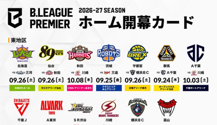 B.LEAGUE新トップリーグ「B.LEAGUE PREMIER(Bプレミア)」の開幕戦カードが決定した。2026年9月…