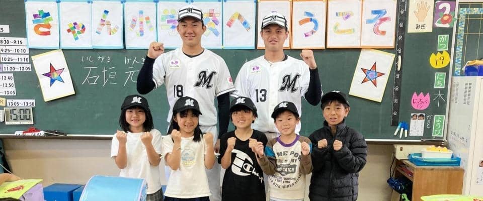 4、5、6年生の児童約40人を対象に、野球体験や質問コーナー、記念撮影などを実施。また、1年生の児童にはロッテのキャップを贈呈するなど、児童と交流を深めた。
