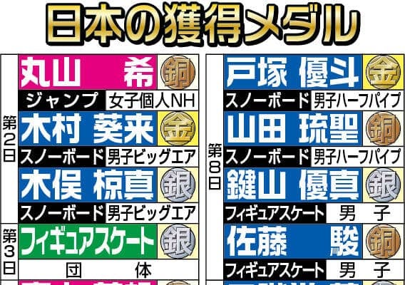 長谷川の銀で今大会日本が獲得したメダル数は20個の大台に乗った。ジャンプ個人ノーマルヒル女子の丸山希が2日目に銅メダルで口火を切った。同じ日にスノーボード男子ビッグエアの木村葵来が今大会日本勢初の金メダルを獲得した。3日目にはフィギュアスケート団体で銀メダル。4日目にはスピードスケート女子1000メートルで高木美帆が銅、スノーボード女子ビッグエアで村瀬心椛が金、ジャンプ男子個人ノーマルヒルで二階堂蓮が銅と一気に3個のメダル。5日目のジャンプ混合団体の銅まで3日連続で日本勢のメダル獲得が続いた。