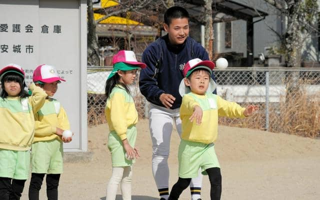 この日は約80人の園児に対し、投げ方や捕り方、ボールをトスして自分で打つ方法などを手ほどきした。園児らは当初、ボールの扱いに慣れていない様子だったが、約30分間のトレーニングでゲーム形式を実践できるまでになった。兵藤伸彦園長は「球技はなかなか難しいが、子どもたちが30分であんなに成長するとは驚いた」。