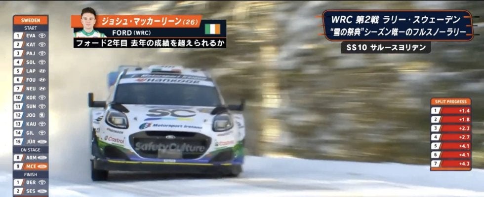 コースアウト寸前の危機一発シーンのようにも見えたが、雪壁によって体勢を立て直したマッカーリーンのマシンは、さらに縦方向への推進力を加速させて、豪快にフィニッシュ。暫定2位、最終的に5位となる好タイムを叩き出した。狙ってぶつけたのか否かは本人のみぞ知るところだが、猛プッシュは素晴らしかった。まさに人間万事塞翁が馬である。(ABEMA『WRC 世界ラリー選手権 2026』/(C)WRC)