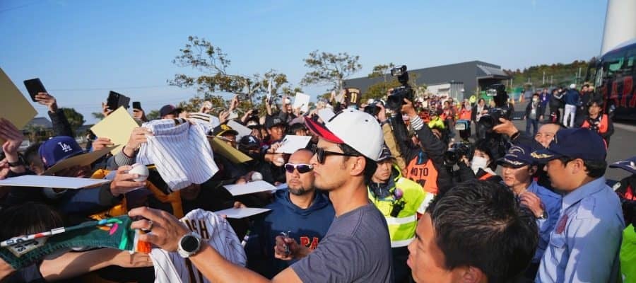 柵の向こう側でファンが待つエリアにダルビッシュが歩み寄ると、無数の色紙やボール、レプリカユニホームなどが差し出された。ファンとの触れ合いの光景を収めようとメディアも集結。ダルビッシュを守るように7人の警備員がガッチリとガード。それぞれが腰に手を回して、“柵”となってスター選手を守っていた。