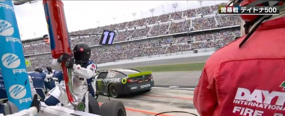 一見、ギブスの54号車が普通にピット作業しているような映像だが、よく見ると別のドライバーのピット。解説の桃田健史氏も「ラグナットが止まってない…違う! チームメイトのところに止まってるんだ!」と気づく。ピットロードを逆走するわけにはいかないということで、同じジョー・ギブスレーシングの11号車のピットへ入る咄嗟の対応をとった形のようだ。