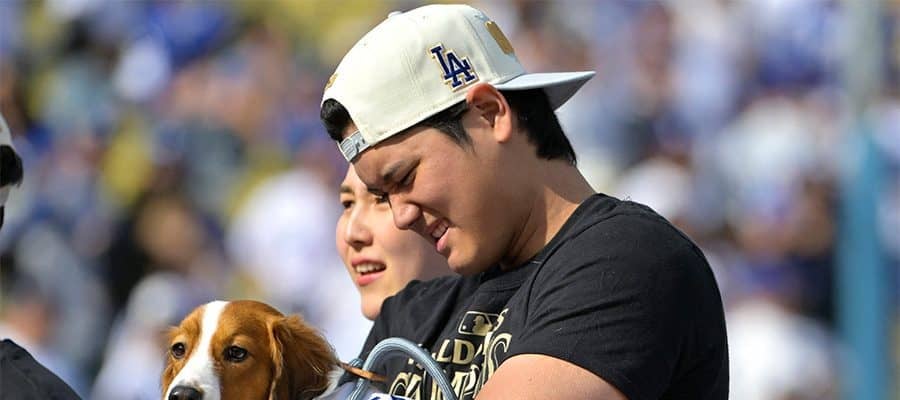 MLB公式がナックの愛犬との2ショット写真を引用 ドジャースの大谷翔平投手の愛犬「デコピン」の可愛らしい様子に、ついにM…
