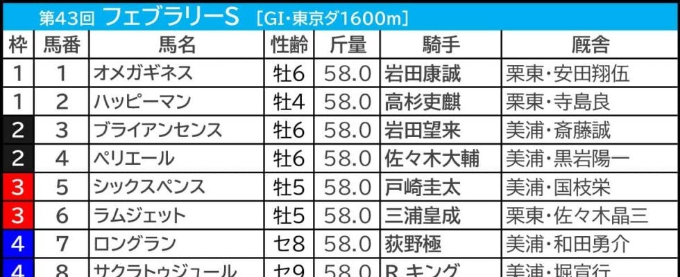 JRAは20日、第43回フェブラリーS(GI、東京ダ1600m)の枠順を発表した。