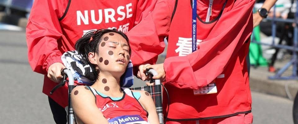 ゴール後には自分で起き上がることができず、スタッフに寝たまま給水してもらうシーンも。その後、車椅子で救護室へ運ばれていた。
