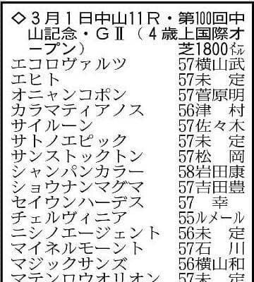 第100回中山記念・G2は3月1日、中山競馬場の芝1800メートルで行われる。