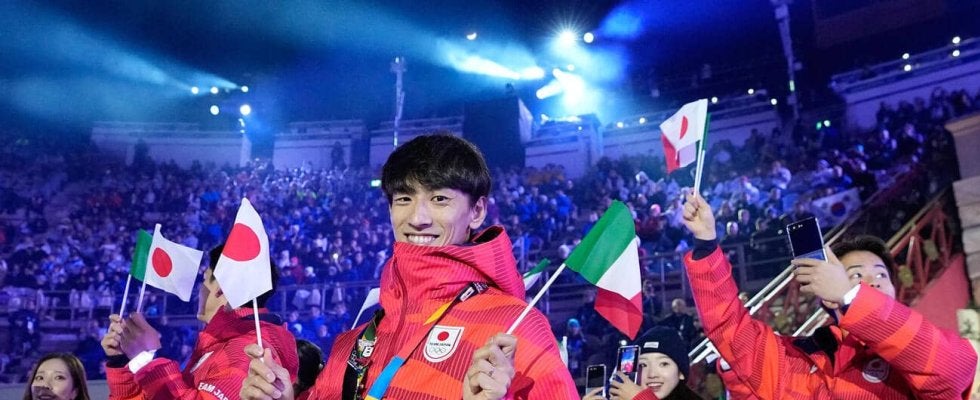 <ミラノ・コルティナオリンピック(五輪):閉会式>◇22日◇ベローナ五輪アリーナ日本選手団が、イタリア国旗を持って入場す…