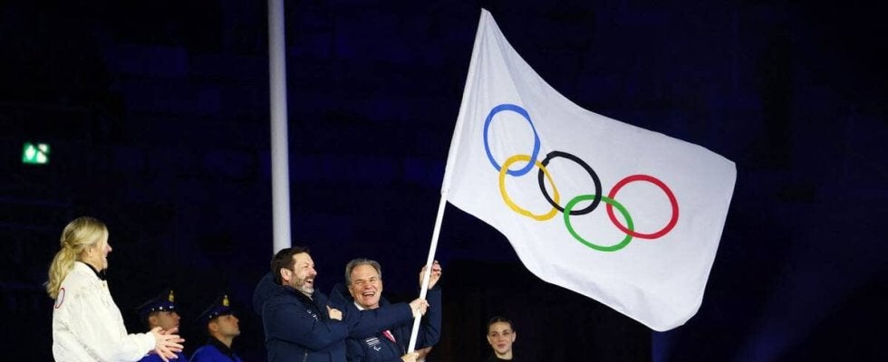 式典の終盤には、次回、第26回2030年大会を開催するフランス・アルプスに五輪旗を渡す引き継ぎ式が行われた。
