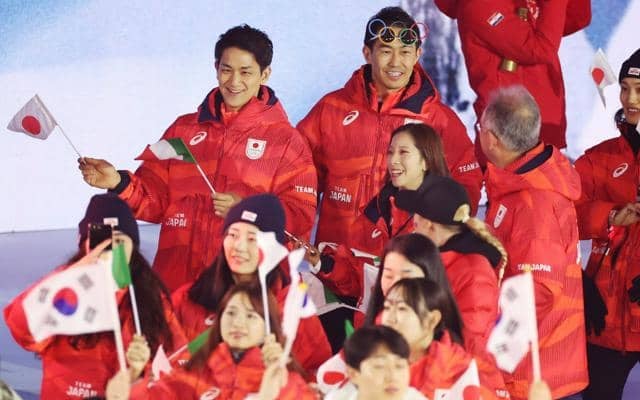 日本の旗手は2人。開会式でも務めたスピードスケートの森重(もりしげ)航(オカモトグループ)と、フィギュアスケートの団体と女子で二つの銀メダルに輝いた坂本花織(シスメックス)が務めた。一緒に旗を持ち、楽しそうに笑顔で歩いた。