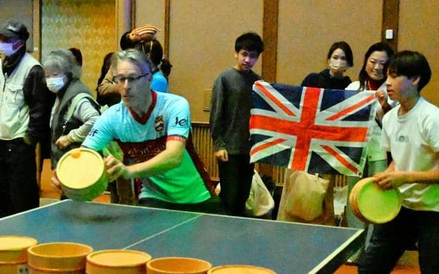 市内に2年前、尼崎市から移住してきた英国出身の英語教員テイム・ギャレスさん(57)は、次男の中学1年ジョージさん(13)とペアを組んだ。予選リーグの初戦は惜しくも負けだった。ジョージさんは卓球部で、丹波篠山市内で上位に入る実力だが、ラケットを桶に持ち替えてのプレーに「両手で打つので球のコントロールが難しかった」と話した。(青木康行)