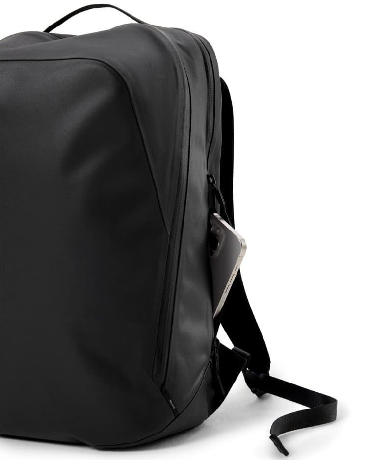メイン素材には400デニールのナイロンツイルを採用した。両面コーティングによる高い耐久性と防水性を備え、止水ジッパーとの組み合わせで防水性と操作性のバランスを最適化している。マットコーティングを施したツイル構造が、表面に深みと質感を与えている。ショルダーストラップにはアークテリクスのハーネス構築システムの技術を応用し、耐久性の高いナイロン製ウェビングコアを薄い二重織りの生地層で包み込むことで、強度と軽量性を両立させた。