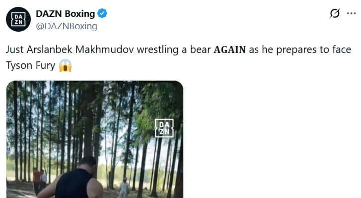 プロボクシング元3団体統一ヘビー級王者タイソン・フューリー(37=英国)の対戦相手が熊と格闘するトレーニングを披露した。4月11日(日本時間12日)、英国のトットナム・ホットスパー・スタジアムで5度目の引退表明を撤回したフューリーの復帰戦の相手となるWBA世界同級6位のアルスランベク・マフムドフ(36=ロシア)がDAZNボクシングの公式X(旧ツイッター)に登場。動画で身長3メートル、体重400キロとされるヒグマと格闘している姿が公開された。