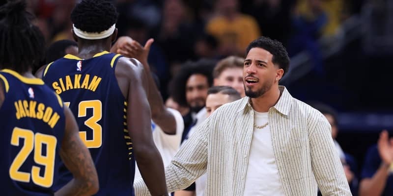 ファイナル第7戦でアキレス腱を断裂したタイリース・ハリバートンは、今シーズン全休も、試合中はベンチ入りしてチームメートたちを鼓舞している。