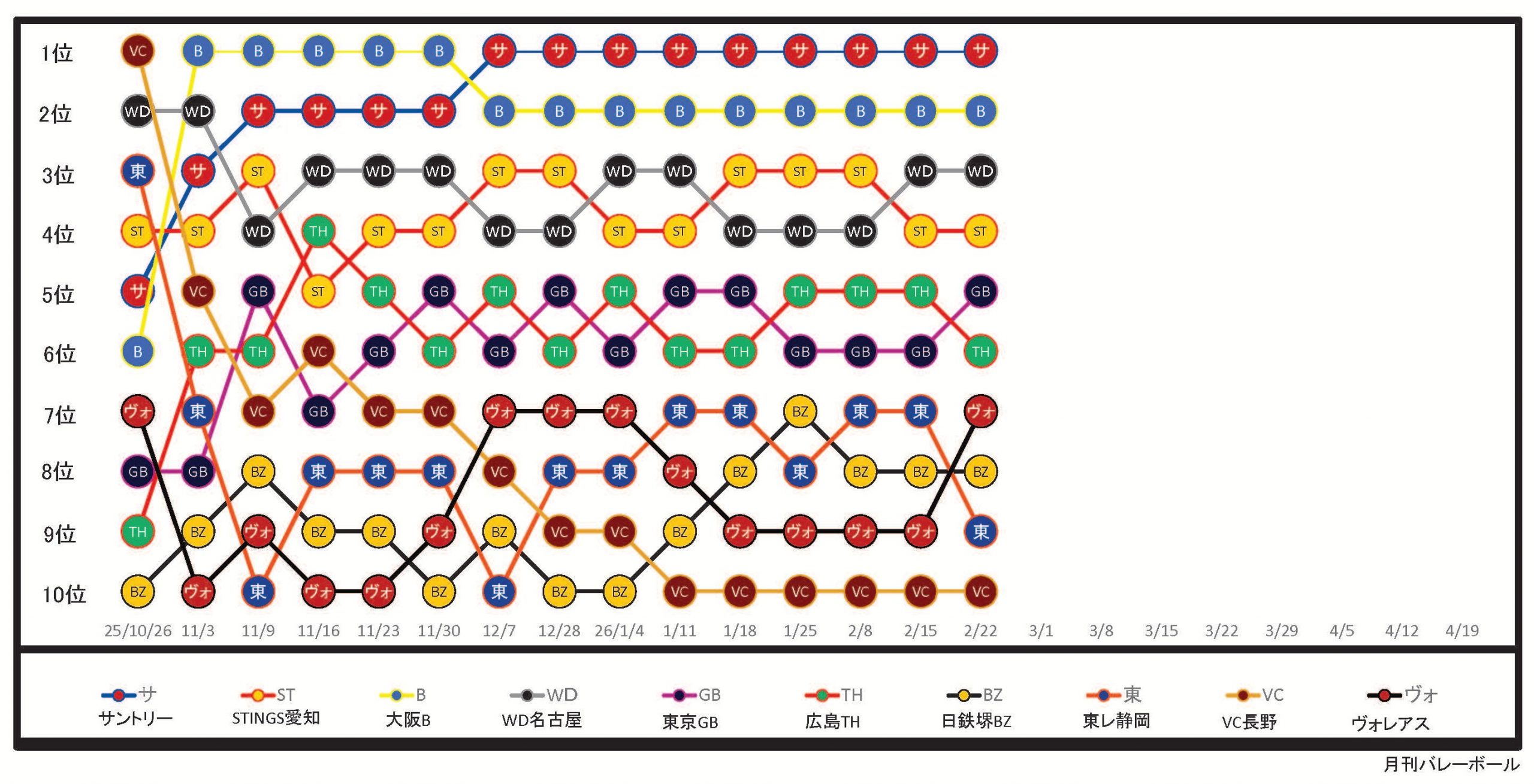 【図】連勝連敗がひと目で分かるSV男子結果一覧(2月22日終了時点)