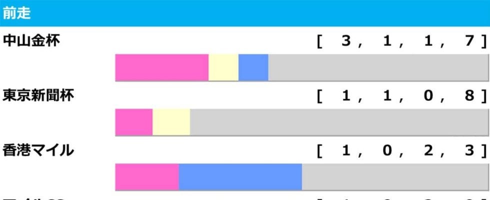 以下、マイル路線組の好走が目立ち、このうち東京新聞杯組は掲示板内が必須。今年は4着のシャンパンカラーは買いとなるが、一方、12着大敗のマジックサンズの巻き返しはハードルが高い。