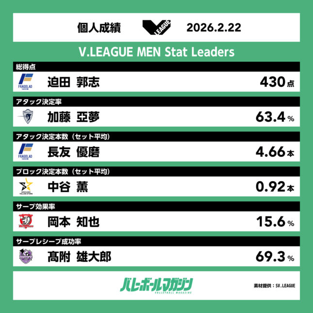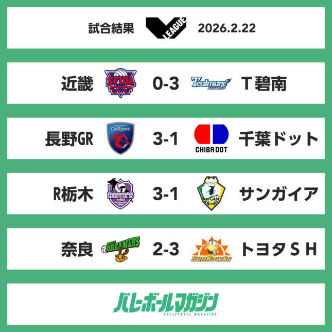 須坂市市民体育館では長野GaRonsと千葉ドットが対戦し、セットカウント3-1でホームの長野GaRonsが勝利。6勝目を挙げた長野GaRonsは順位を1つ上げて6位に浮上した。千葉ドットは順位を1つ下げて7位に後退した。