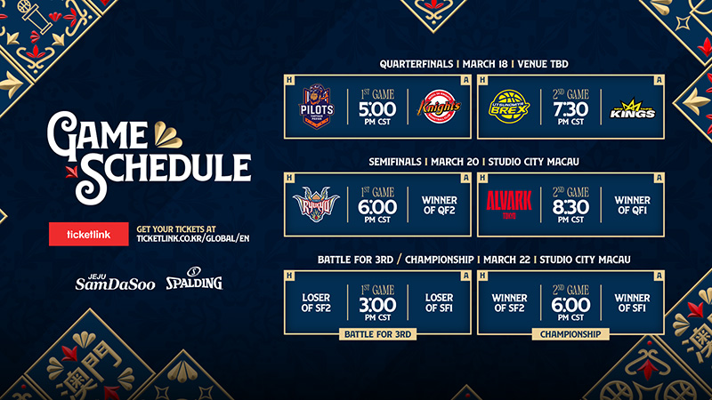 大会は3月18日の準々決勝、20日の準決勝、22日の3位決定戦および決勝戦のスケジュールで実施される。準々決勝では桃園パウイアン・パイロッツ対ソウルSKナイツ(日本時間18時/現地時間17時)、宇都宮ブレックス対ニュータイペイキングス(日本時間20時30分/現地時間19時30分)が予定されている。