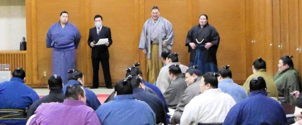 新十両の藤天晴(19)=藤島=と寿之富士(25)=伊勢ケ浜=が25日、十両以上の関取による親睦会、力士会に初参加した。入り口近くで先輩を出迎えた二人。開始時には議長の琴桜から関取衆への紹介が行われた。