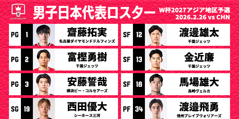 2月25日、日本バスケットボール協会(JBA)は、同26日の「FIBAバスケットボールワールドカップ2027 アジア地区予選 Window2」男子中国代表(FIBAランキング27位)戦に臨む男子日本代表(同22位)のロスター12名を発表した。