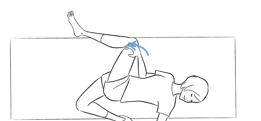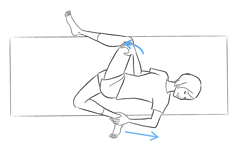 3.左手首から先は脱力し、つかんでいる右手で左手首を引いて左ひざを胸へ引き寄せます。