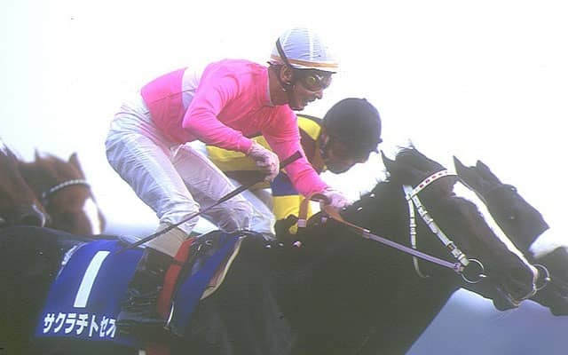 まずは94年のサクラチトセオーだ。93年の3歳時はNHK杯が3着、日本ダービーが11着。その後の長期休養を経て、94年2月に復帰すると、2戦目の900万下特別を快勝する。そこから中2週で中山記念に格上挑戦した。単勝6.7倍の3番人気に推された一戦、道中は中団で脚をためて、直線で馬場の真ん中から鋭伸。古豪のフジヤマケンザンをかわすと、内から迫ったケントニーオー(2位入線→5着降着)をクビ差凌いでゴール。重賞初制覇を果たしたのだった。その後はマイルから2500mまでの幅広い距離で活躍。翌95年の天皇賞(秋)でGIウイナーの仲間入りを果たした。