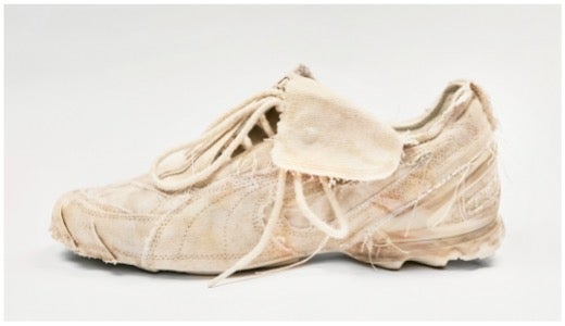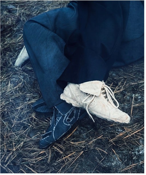 JiyongKimは自然光による色のフェードを活かす独自の「Sun-Bleach(サンブリーチ)」手法を特徴とするブランドだ。本コレクションのデザインは、アトリエに長年保管されてきた余剰生地から着想を得ている。時間の経過によって生まれたシミや色褪せを素材の特性として捉え直し、製造工程で生まれる偶発性も意図的にデザインへ反映している。一足ごとに微細な個体差を持ち、着用を重ねることで履き手の痕跡を刻み込む設計となっている。