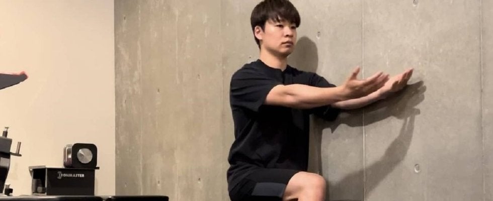 1. 準備壁に対して横向きに片膝立ちの姿勢を取ります。前脚は90度に曲げて膝を立て、後ろ脚は膝を床につけて固定します。