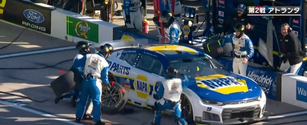 トラブルに見舞われたのは、9号車をドライブするチェイス・エリオット。レース中のピット作業時、中継映像が複数のマシンのピットインを捉える中、エリオットのマシンが自陣のピットボックスをオーバーシュート(通り過ぎる)してしまう事態が発生した。