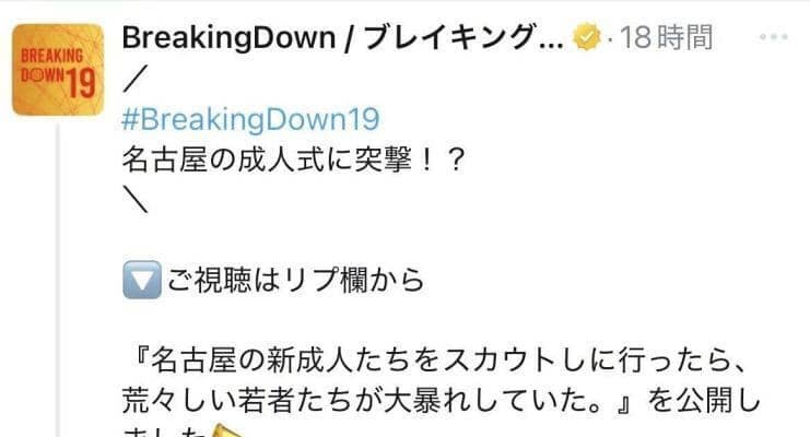 街中でスーツ姿のやんちゃそうな新成人をスカウトしていると、地下格闘技・RUMBLE所属の選手が乱入。滉司と名乗る選手が「RUMBLE代表としてやりたいっすね」とアピール。すると、先ほどまでインタビューを受けていたサングラスを掛けた新成人が「RUMBLEってなんや。俺らがインタビュー受けとったんや」と詰め寄り、小競り合いに発展し、名古屋の街が騒然。瓜田らが「やめろやめろ、手を出すな」、「喧嘩すんな」、「髪の毛離せ!」、「やめろ!殴んな!殴んな!」と叫びながら止める姿があった。