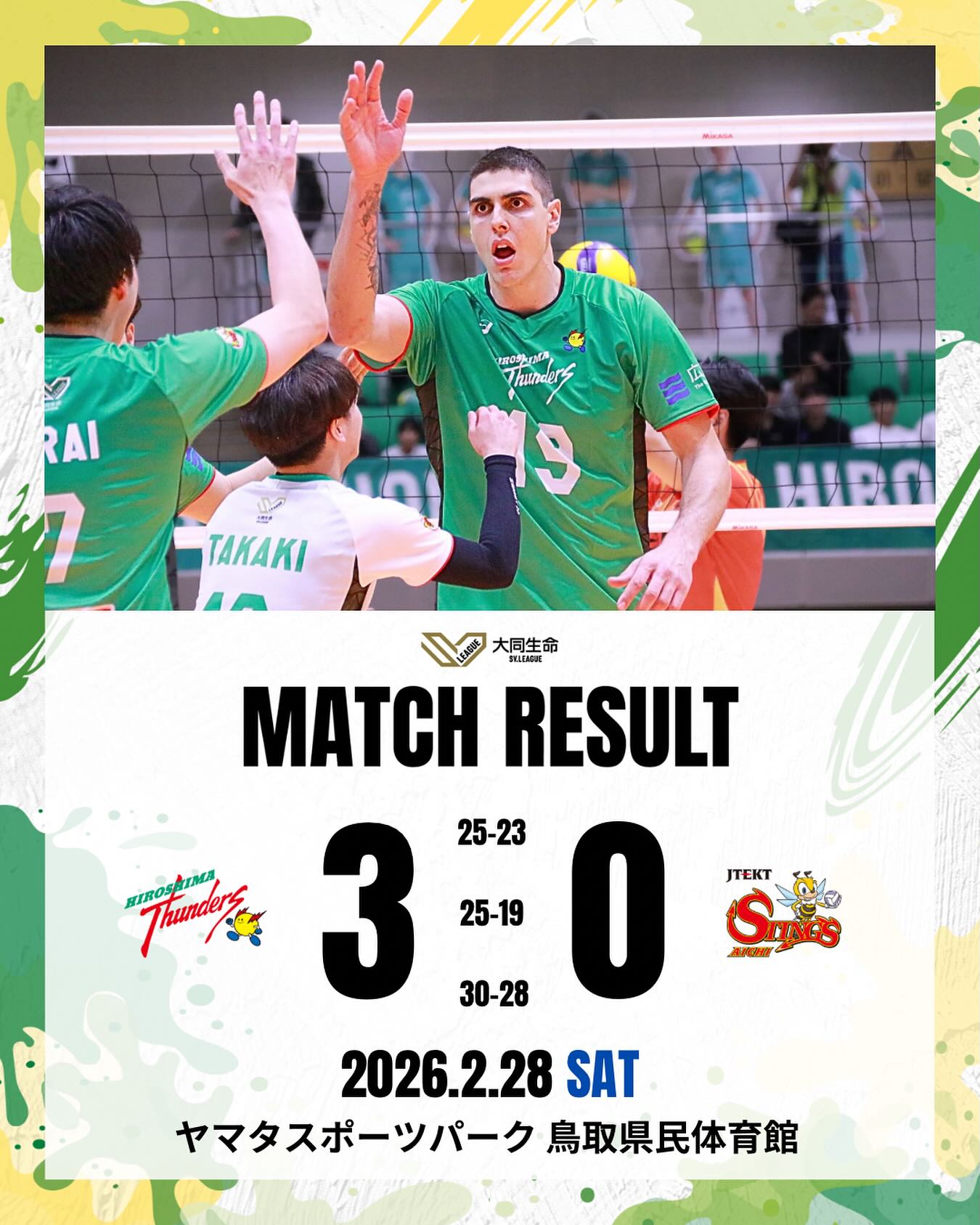 2025-26大同生命SVリーグ男子の第15節が2月28日、鳥取県民体育館で行われた。広島サンダーズが3セット連取の完勝…