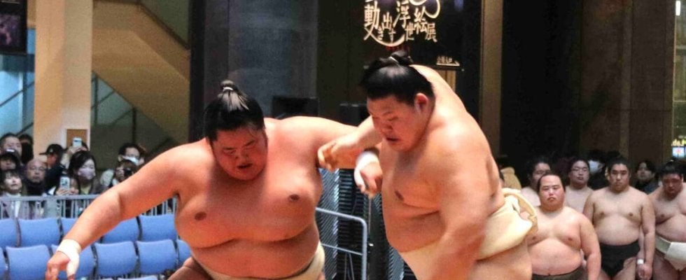 大阪駅近くの商業施設・グランフロント大阪で大の里(右)と琴桜が相撲を取る稽古を行う