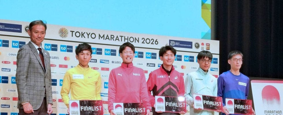 東京マラソンで新たに5人がMGC出場権を獲得した(左から日本陸連・高岡寿成・強化委員会シニアディレクター、鈴木健吾、市山翼、近藤亮太、工藤慎作、藤村共広)