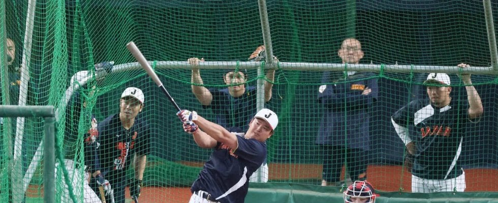 【写真】打撃練習する侍ジャパン村上とケージ後方から見る左から吉田、近藤、大谷ひとりおいて鈴木(撮影・加藤哉)