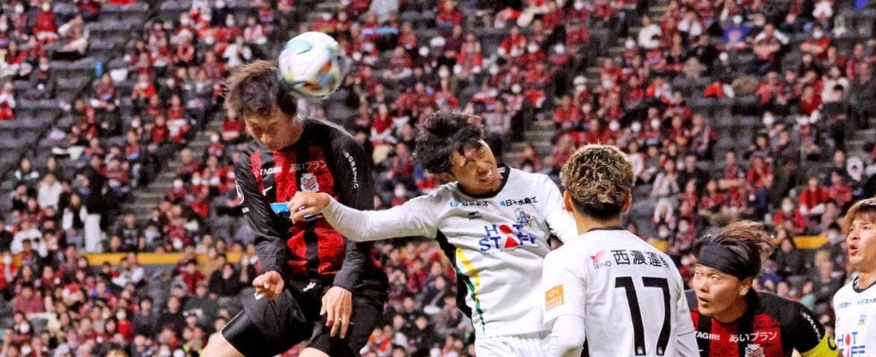 岐阜戦でヘディングシューを放つJ2札幌MF荒野拓馬(左から2人目)