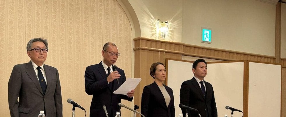 【写真】流通経済大の男子サッカー部で違法薬物の使用疑いがあり、緊急会見を開き片山直登学長(左から2人目)らは謝罪した