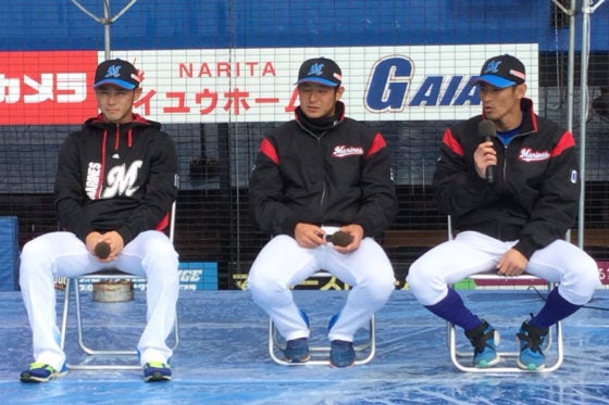 ZOZOマリンで23日に行われたファン感謝デーの目玉企画「謎の魚トーク」に登場したのは、来季の活躍が期待される平沢、吉田、荻野の3選手。「生息域はどこ?」の質問に「木更津、富津」、「年は?」には「大分昔から海にいるのでわからない」など珍妙な答えで、「謎の魚」から来季の目標を聞かれた平沢は「年上の彼女です」と答えをはぐらかし、笑いを誘った。