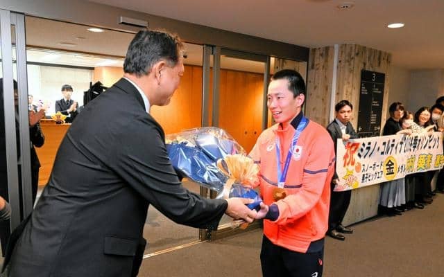 岡山県県民栄誉賞の授与式に先立ち、県庁職員から花束を贈られるミラノ・コルティナ冬季五輪金メダリストの木村葵来選手(右)=県庁