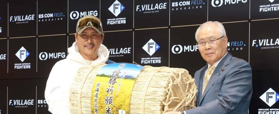 エスコンフィールドで5日、北広島市から日本ハムへ優勝祈願米の贈呈式が行われた。同市の上野正三市長(77)から日本ハム新庄…
