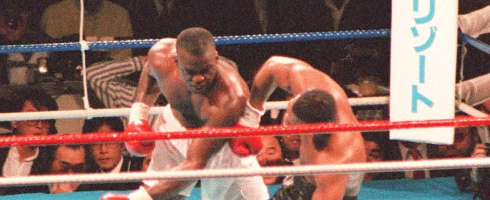 1990年2月の世界ヘビー級タイトルマッチで、ジェームス・ダグラス(左)の左フックで吹き飛ばされるマイク・タイソン