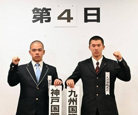 対戦が決まり健闘を誓う神戸国際大付の井本康太主将(左)と九州国際大付の城野慶太主将=2026年3月6日午前10時18分、大阪市北区、代表撮影