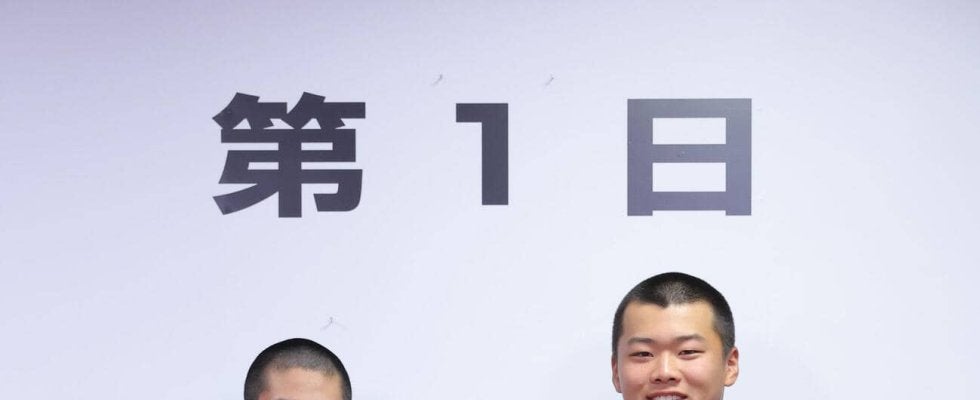 【写真】対戦が決まり健闘を誓う阿南光の佐藤柊平主将(左)と中京大中京の荻田翔惺主将(代表撮影)